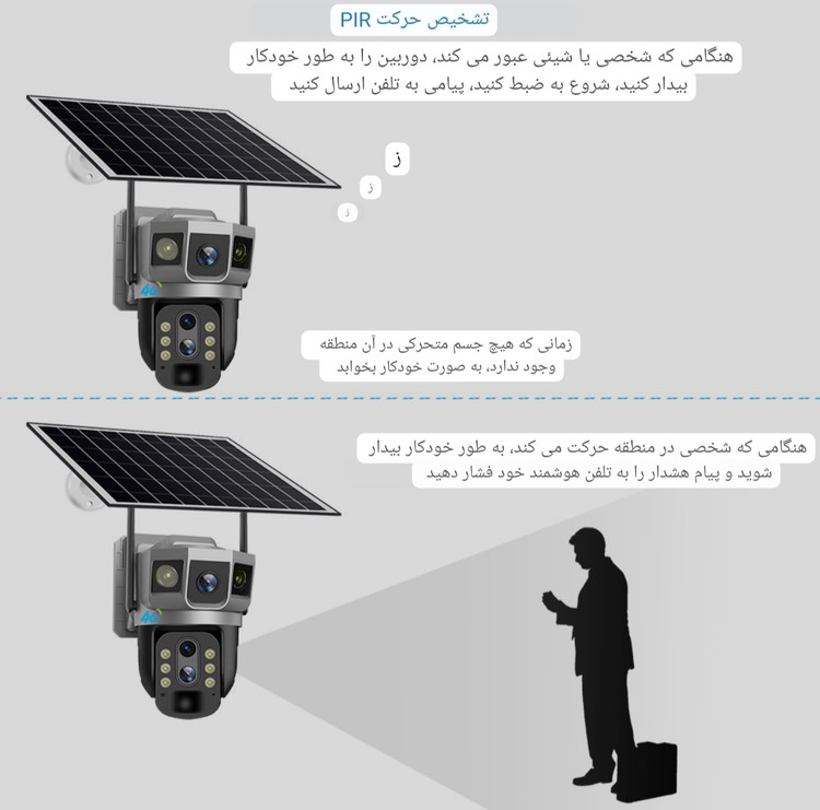 پنل خورشیدی دوربین سولار سیمکارتی که دارای سیمکارت و پنل خورشیدی هستند، از منابع انرژی خورشیدی برای تأمین نیازهای خود استفاده میکنند. این ویژگی امکان استفاده مداوم از دوربین را بدون نیاز به اتصال به شبکه برق محلی فراهم میکند. با این حال، باتوجه به شرایط آب و هوایی و موقعیت جغرافیایی، این دوربین سولار سیمکارتی سه لنز دارای باطری داخلی نیز میباشد ممکن است نیاز به شارژ مکمل از طریق منبع برق خارجی هم داشته باشند. اما استفاده از پنل خورشیدی به مقدار قابل توجهی کمک میکند تا نیاز به شارژ مکرر دوربین کاهش یابد و محیط زیست را حفظ کند. این دوربین سولار سیمکارتی دارای 4عدد باتری داخلی قابل شارژ 13000 میلی آمپر ساعتی میباشد. رم میکرو SD پشتیبانی از کارت حافظه 8 تا 128 گیگابایت، به طور خودکار هنگامی که کارت های SD را در دوربین قرار می دهید شروع به ضبط میکند، زمانی که فضای ذخیره سازی پر شود از حلقه زمانی استفاده میکند. ضد آب و ضد گرد و غبار کاملا ضد آب IP66 مناسب برای فضای باز آماده برای هر شرایط آب و هوایی، به راحتی با محیط هی پیچیده در فضای باز مقابله کنید. تشخیص حرکت تشخیص حرارتی سنسور PIR، هنگامی که این سنسور فعال شود شروع به ردیابی خودکار، ضبط حرکت انسان و ارسال اعلان هشدار سریع میکند.